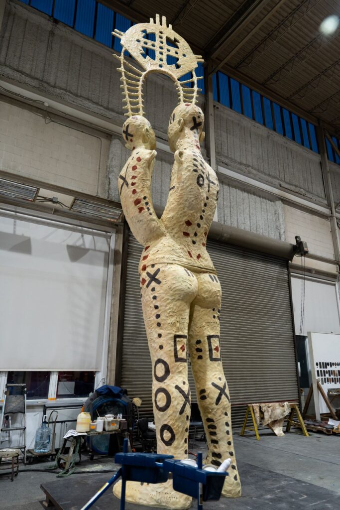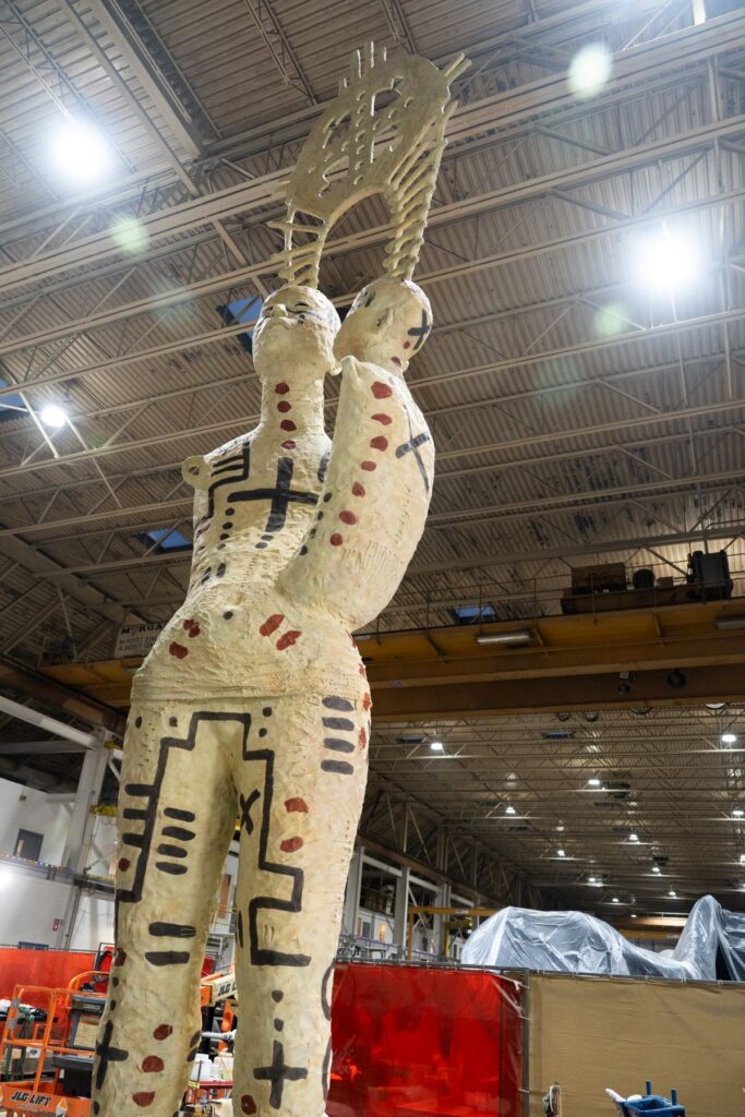 Rose B. Simpson’s Behold stands 24 feet tall and features two figures majestically presiding over the museum’s façade — a parent and child attached together at the hip and connected by beaded necklaces and an ornamental ladder. Rather than commemorating individuals, the sculpture honors relationships, intergenerational connection, and spiritual witnessing.