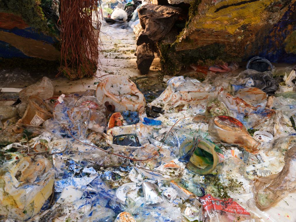 SJ: The commission includes works that hang on the walls and a sculptural centerpiece, which I realized would be too large to get out the door of my studio in Savannah, so we moved it to my studio in Saint Remy, New York, which has huge French doors. It became a very organic piece influenced by that environment of the woods with elements of logs, and plastics that wash up on shores. All of the plastic garbage I’ve overpainted and distressed. One of the things I loved in theater and set design was distressing. I’m good at getting things ugly and dirty looking. It should look as if it’s washed up from the ocean onto this beautiful structure full of moss and wood.