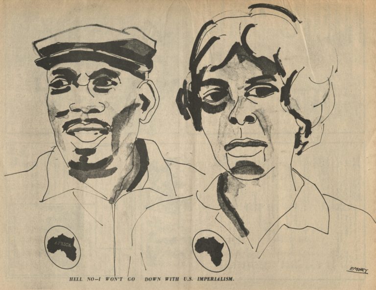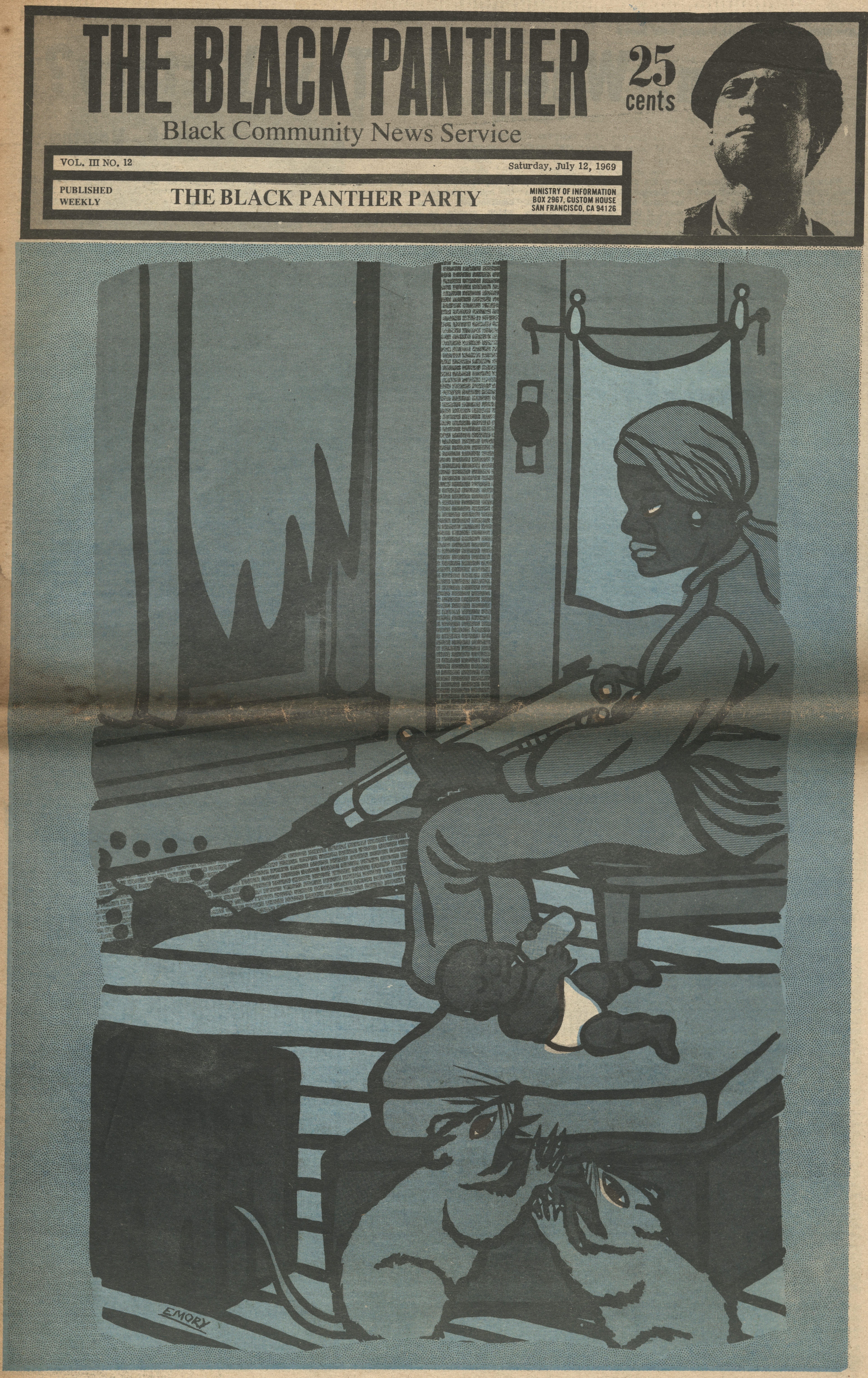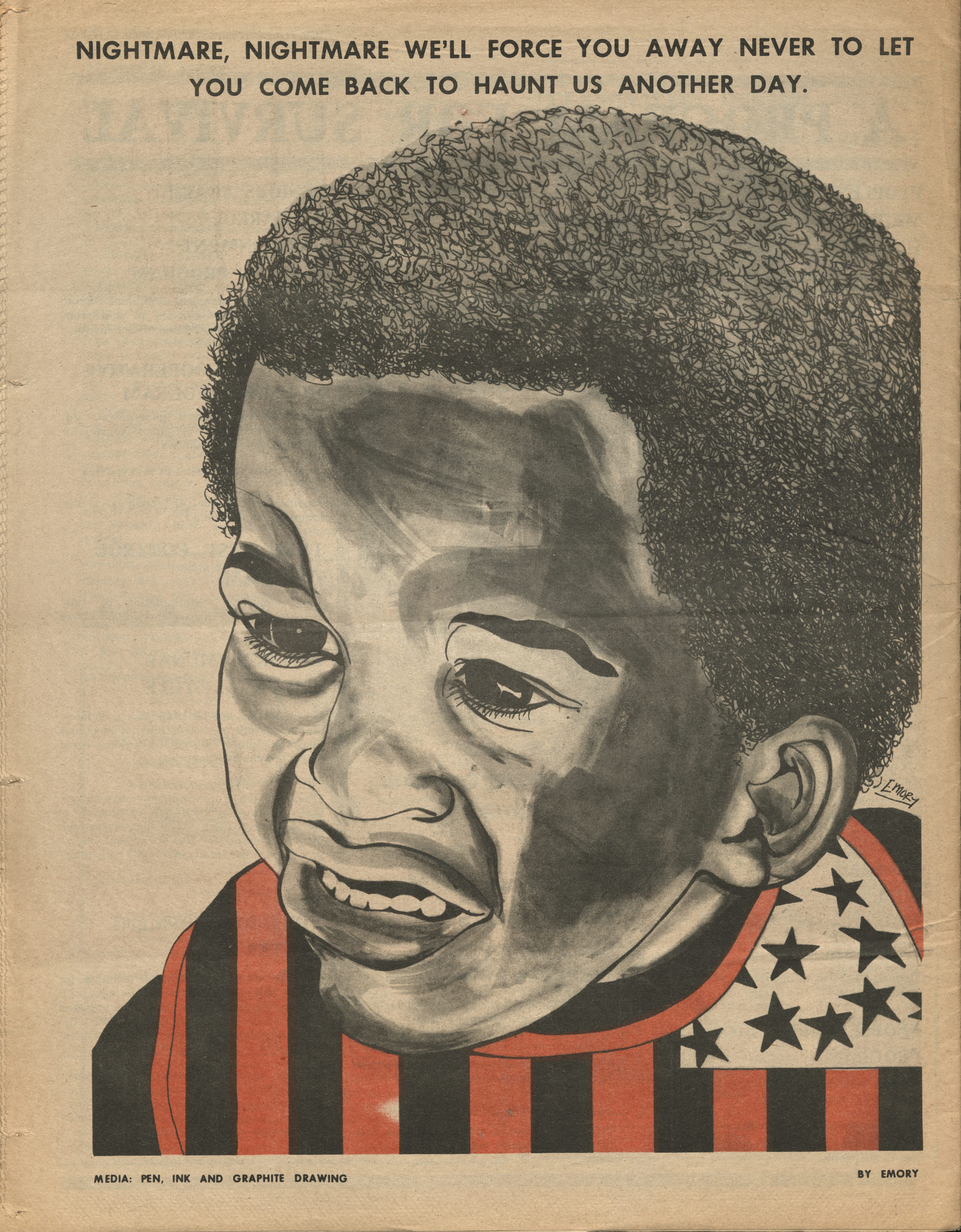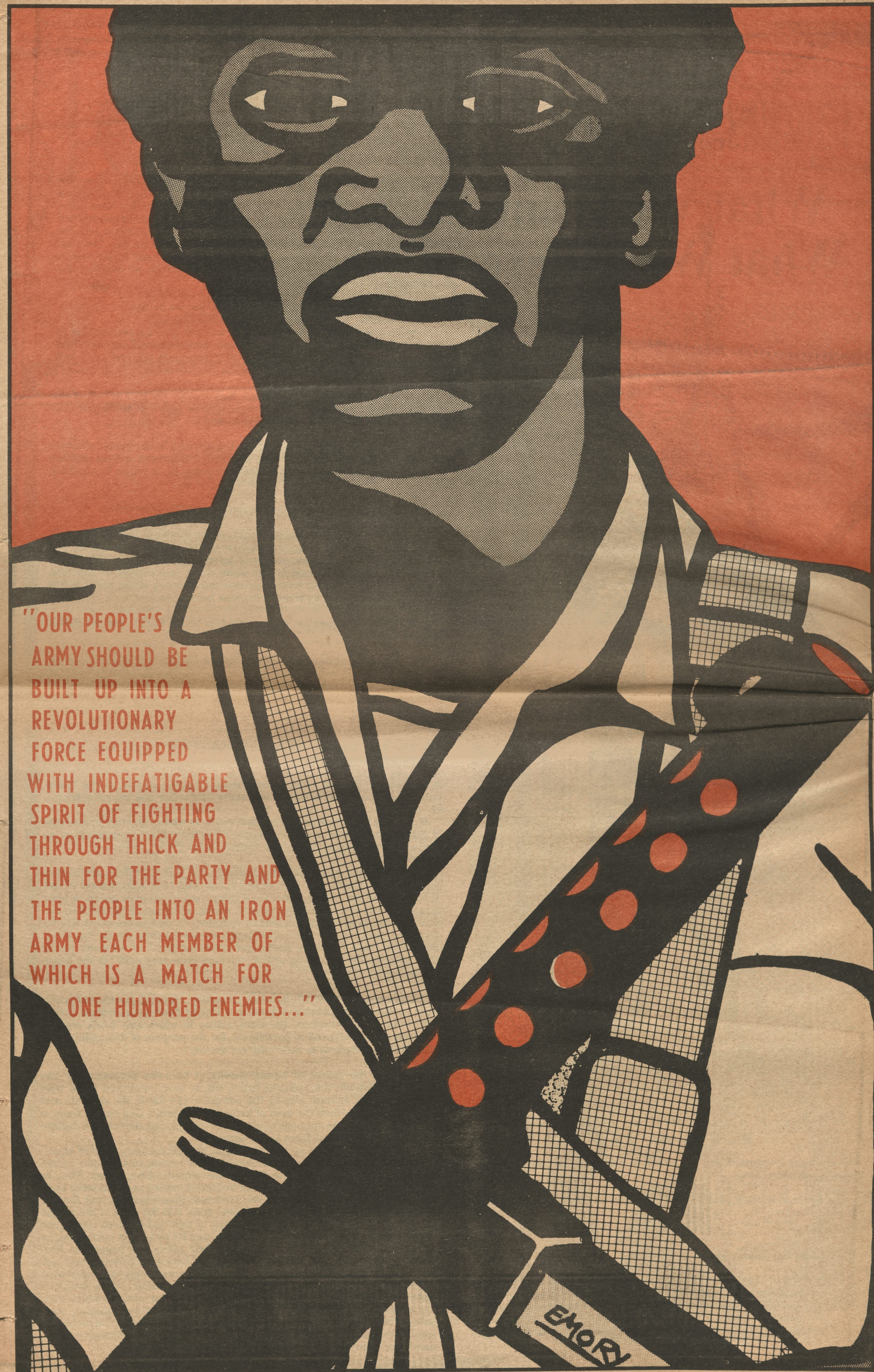 Emory Douglas has been harnessing graphic art as a form of social justice for more than fifty years. Douglas learned graphic design at the City College of San Francisco and later worked as a commercial artist. In 1967, he became the Revolutionary Artist and then Minister of Culture for the Black Panther Party and developed the design of the Black Panther newspaper. There, Douglas began featuring more graphic elements, including his illustrations and collages alongside the paper’s reporting on current events and party ideology. Douglas depicted issues faced by Black Americans that were central to the party’s Ten Point Platform and Program, spotlighting abuse and killing by police, incarceration, the right to self-defense, inequalities of the justice system, and solidarity with social justice organizations and international human rights movements. Using the simple tools of paste-up production, Douglas developed an accessible and provocative visual language that has inspired generations of politically engaged artists throughout the world.