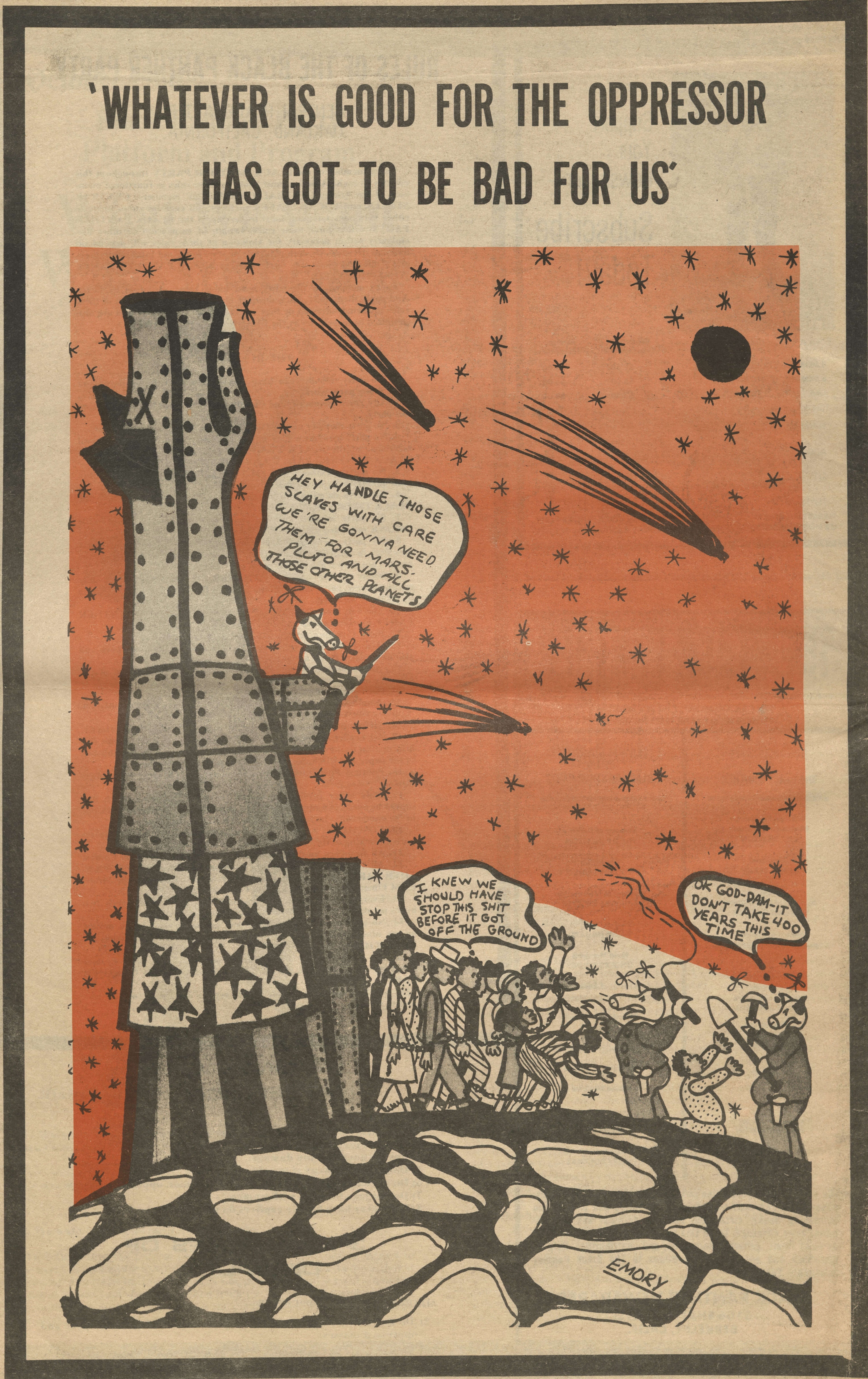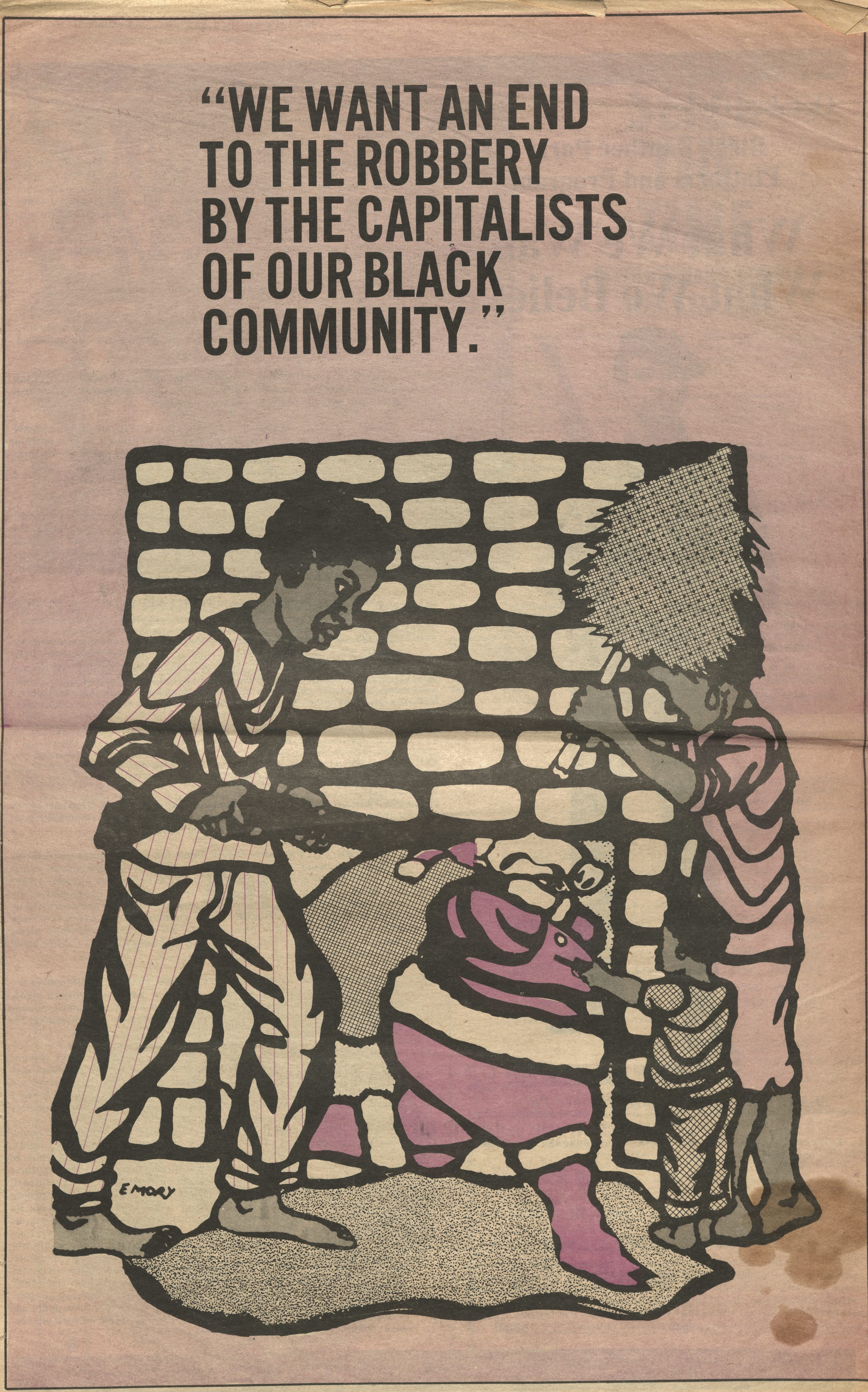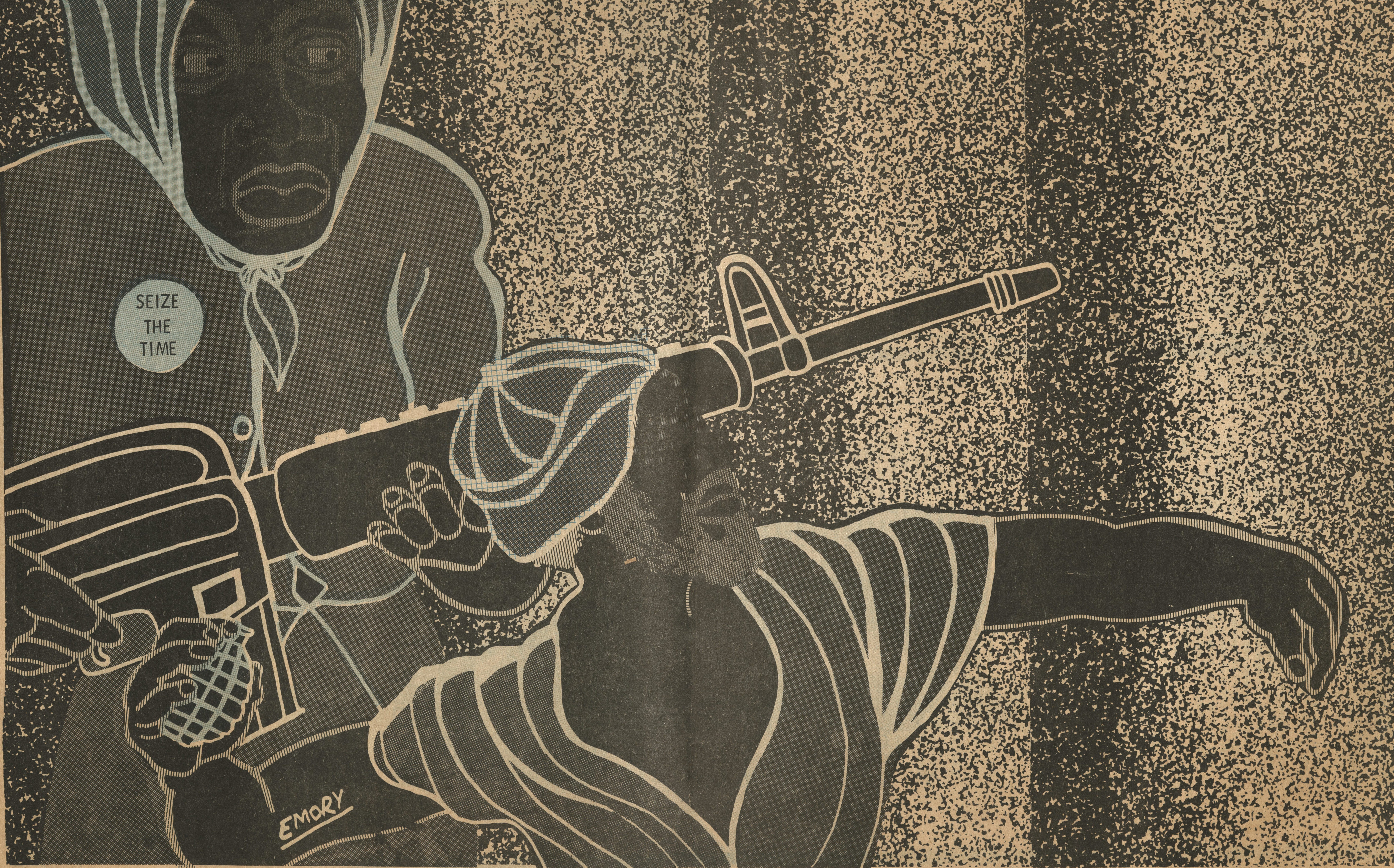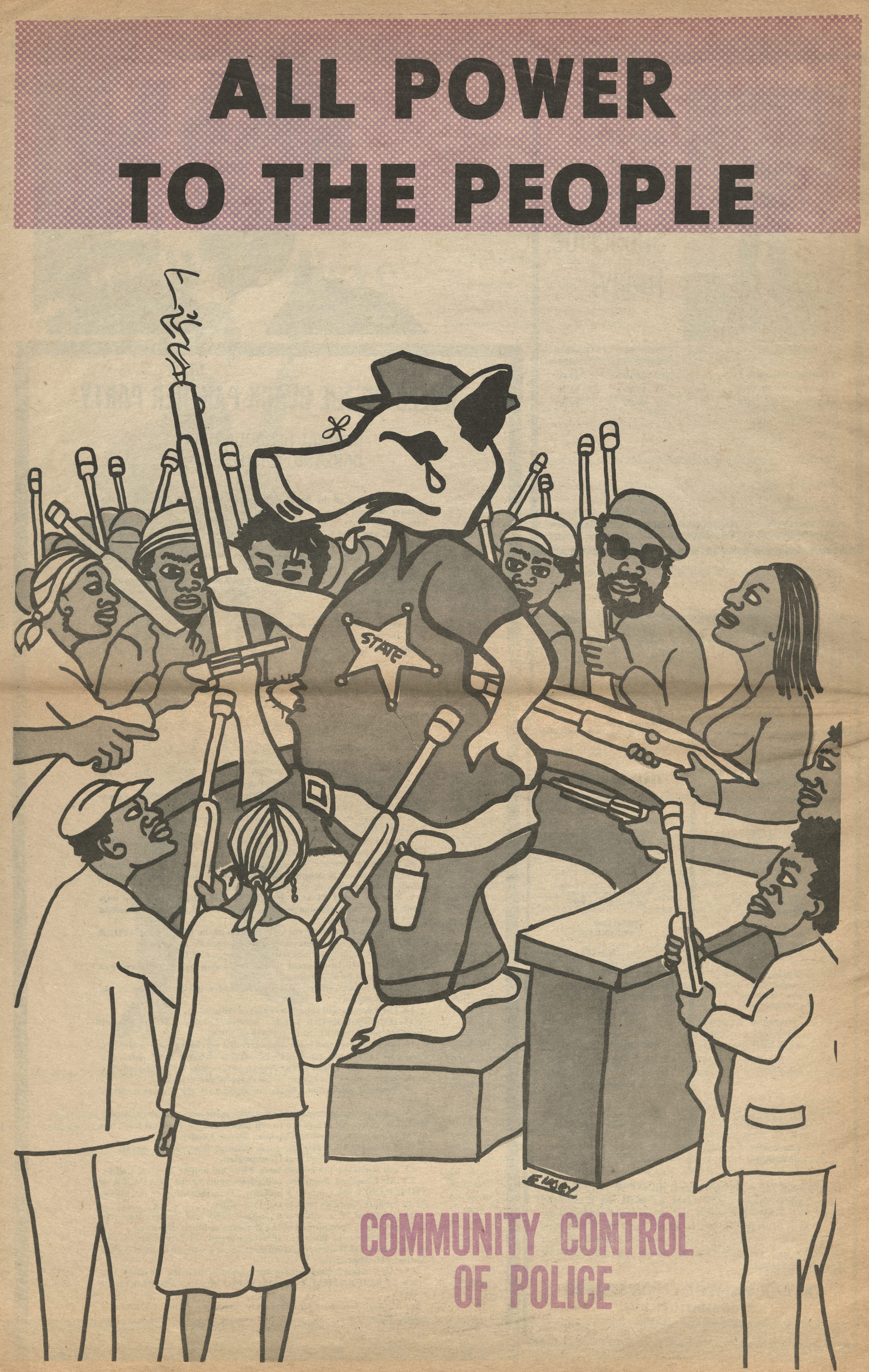 Emory Douglas has been harnessing graphic art as a form of social justice for more than fifty years. Douglas learned graphic design at the City College of San Francisco and later worked as a commercial artist. In 1967, he became the Revolutionary Artist and then Minister of Culture for the Black Panther Party and developed the design of the Black Panther newspaper. There, Douglas began featuring more graphic elements, including his illustrations and collages alongside the paper’s reporting on current events and party ideology. Douglas depicted issues faced by Black Americans that were central to the party’s Ten Point Platform and Program, spotlighting abuse and killing by police, incarceration, the right to self-defense, inequalities of the justice system, and solidarity with social justice organizations and international human rights movements. Using the simple tools of paste-up production, Douglas developed an accessible and provocative visual language that has inspired generations of politically engaged artists throughout the world.